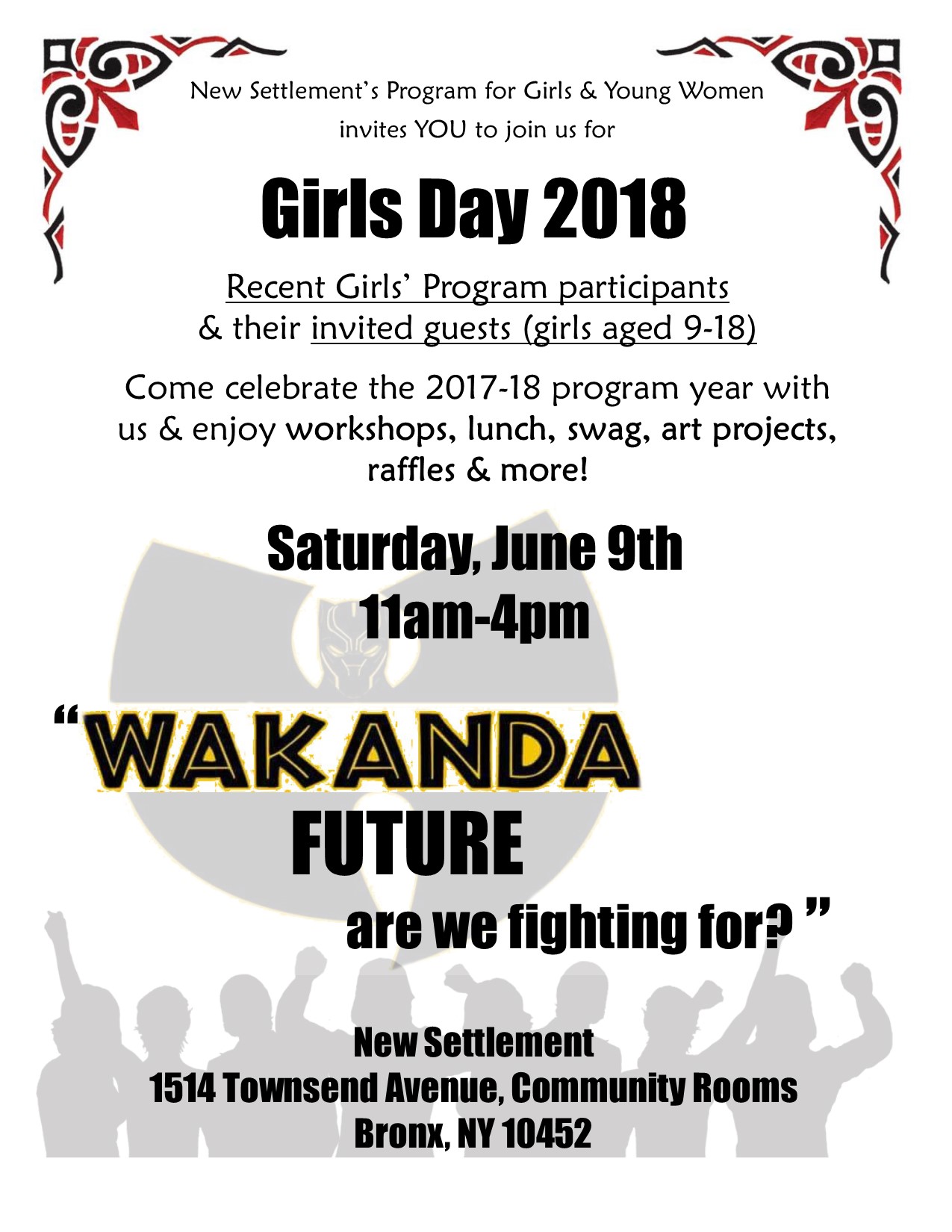 Community Rooms 1514 Townsend Avenue, BronxThis event is for current and recent participants in New Settlement's Program for Girls & Young Women, and their invited guests (girls or young women aged 9-18). 11am-4pm, Saurday June 9th. Main space will be community Room 1, with breakout workshops in nearby community rooms and spaces. Food, art projects, raffles, give-aways, workshops and special […]